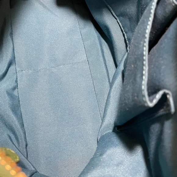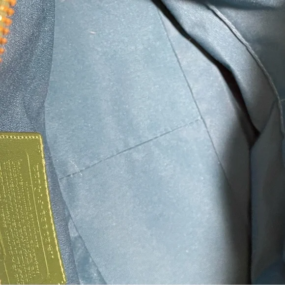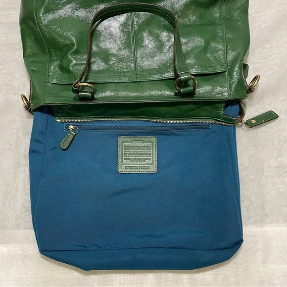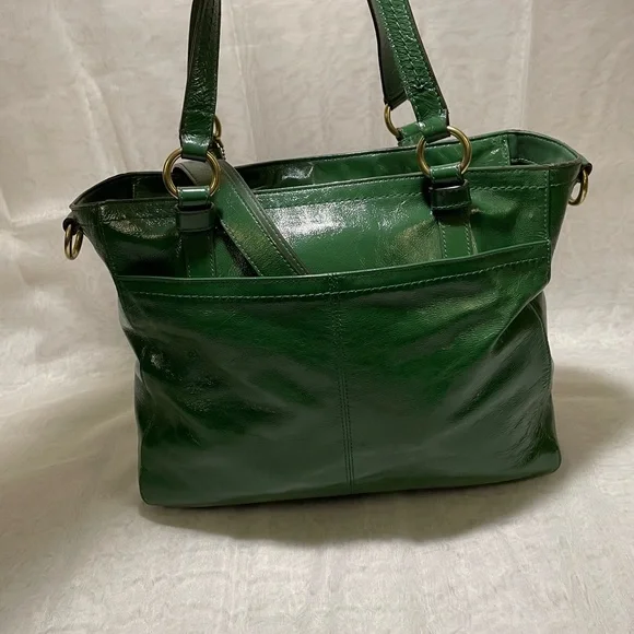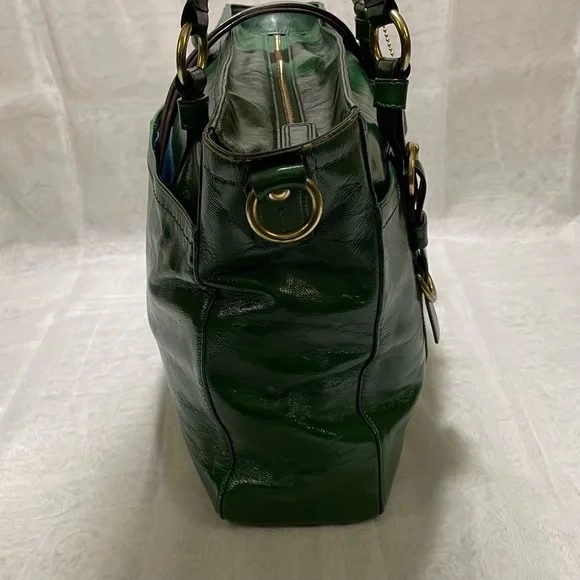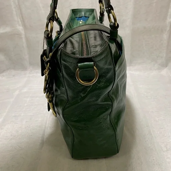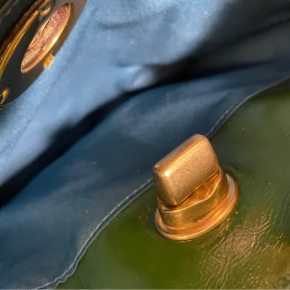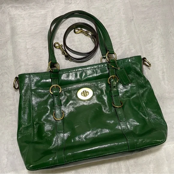 Leather bag•Gorgeous green patent leather+Brass hardware•Zipper closure•Handles plus detachable shoulder strap for crossbody carrying if desired•Front pocket with gold turnlock closure+Back slip pocket•Interior:Two slip and one zipper pocket + Aqua Blue Lining•Throughly cleaned and conditionedEUCApproximately 16 X 10 X 4 inches, handle 8 inch drop and 17 inch strap drop