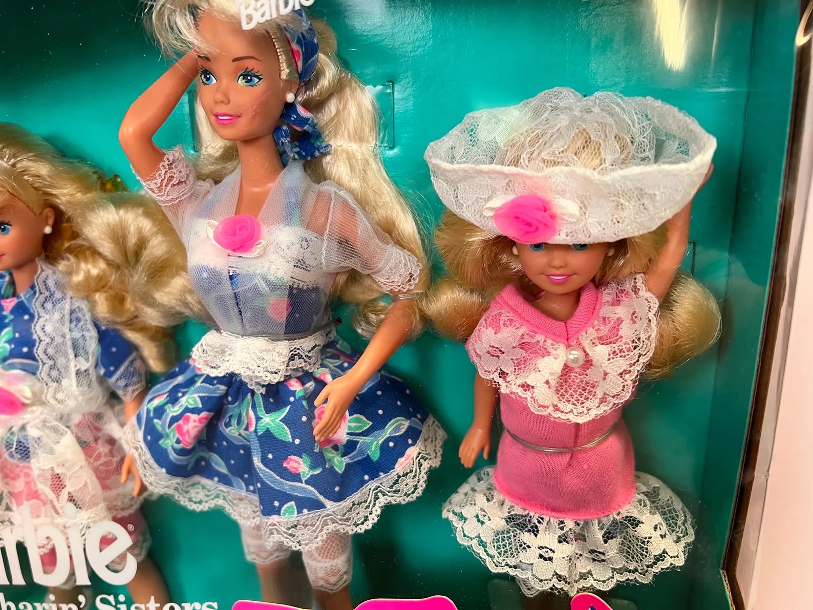 Vintage Barbie Sharin’ Sisters, Barbie Skipper Stacie set, Mattel collectible dolls, NRFB Barbie set, 90s Barbie family dolls, vintage Barbie trio, sealed Barbie set, retro toy collectible, nostalgic Barbie lot, display dolls